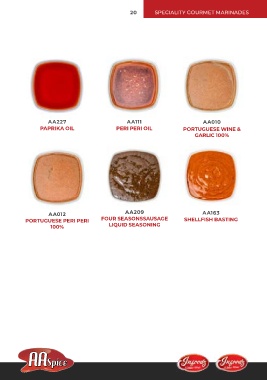 20 SPECIALITY GOURMET MARINADES AA227 A A111 AA010 PAPRIKA OIL PERI PERI OIL PORTUGUESE WINE & GARLIC 100% AA012 AA209 A A163 PORTUGUESE PERI PERI FOUR SEASONSSAUSAGE SHELLFISH BASTING 100% LIQUID SEASONING
