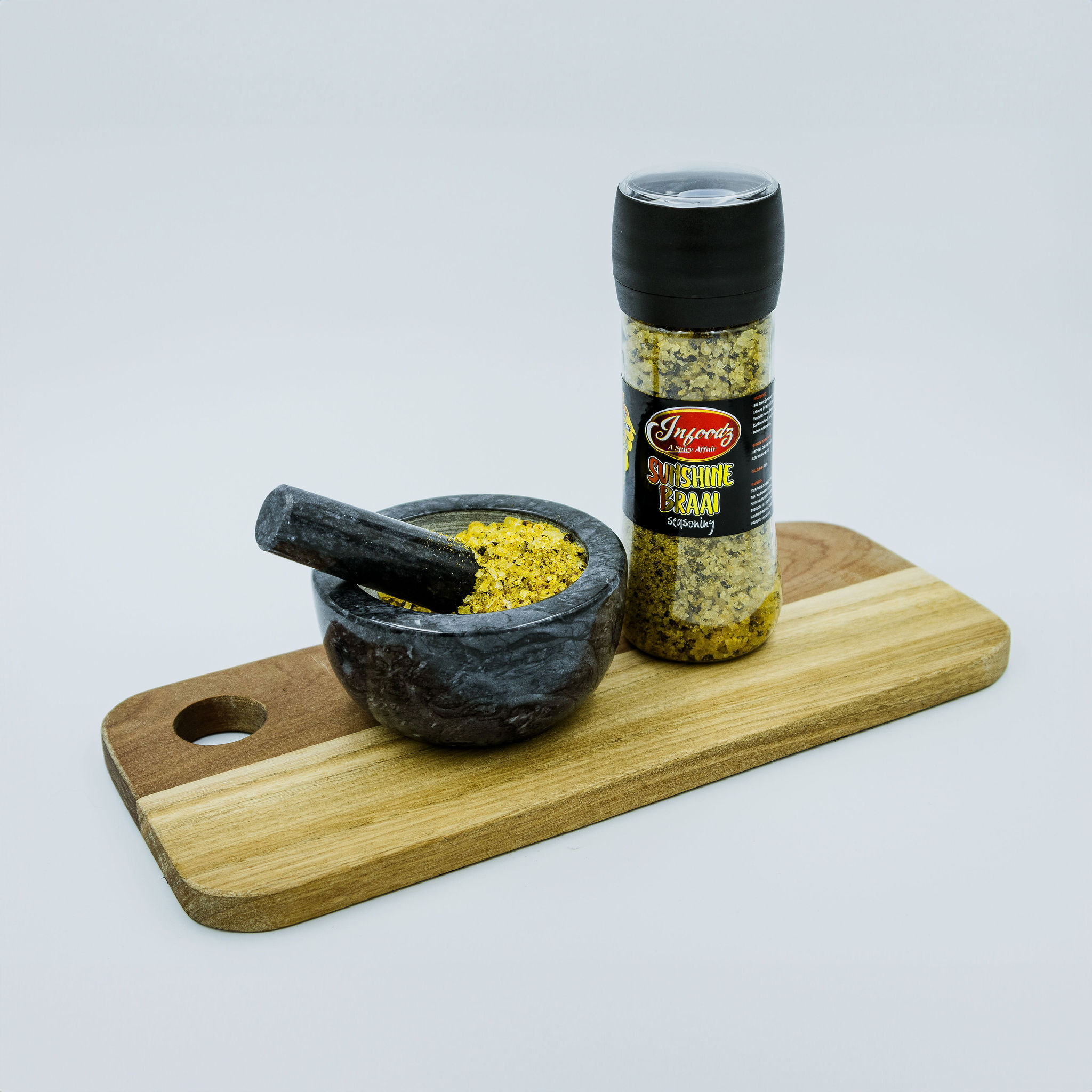 Sunshine Braai Spice is coarse and golden with a vibrant yellow-orange colour, blended with crushed pepper, salt crystals, and dried onion flakes. Aromatic and punchy with a balanced savoury profile, perfect for seasoning meats and vegetables before hitting the braai.